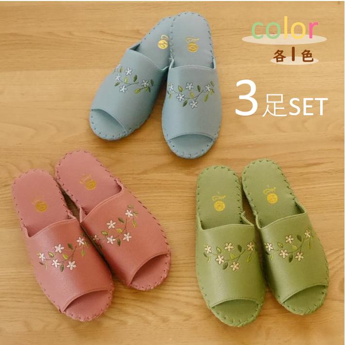 【送料無料】3足セット レガート三つ花 レディース 各1色ずつ Mサイズ(約22.5〜23.5cm)Lサイズ(約23.5〜24.5cm) おしゃれ 通年用 レザー風 滑り止め サンダル風 ルームシューズ 【履いていて楽ちん♪ハンドメイドの手編み製法】